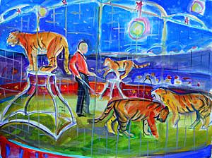 Cette artiste peintre a réalisé plusieurs dizaines d’études sur le cirque où elle a réussi chaque fois à faire passer ses émotions en utilisant la piste, la couleur et la lumière comme parties essentielles de son travail comme le démontrent encore une fois ces quatre autres créations, avec à chaque fois moult symboles.